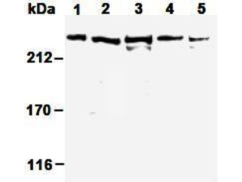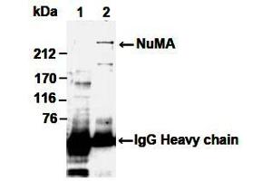 NuMA (Nuclear Mitotic Apparatus Protein) is involved in maintenance of nuclear structure and in the assembly of the mitotic spindle. During interphase, NuMA is present throughout the nucleus, and during mitosis, it localizes to the spindle. It associates with microtubule motors during mitosis, and plays an essential role in anchoring microtubule ends to the spindle poles. NuMA is an autoantigen, and some individuals with connective tissue disease or other autoimmune disorders have antibodies directed against the NuMA protein. Recent data suggests NuMA (240 kDa) is cleaved to a 180-200 kDa form during apoptosis.Synonyms: NUMA1, Nuclear mitotic apparatus protein 1, SP-H antigen