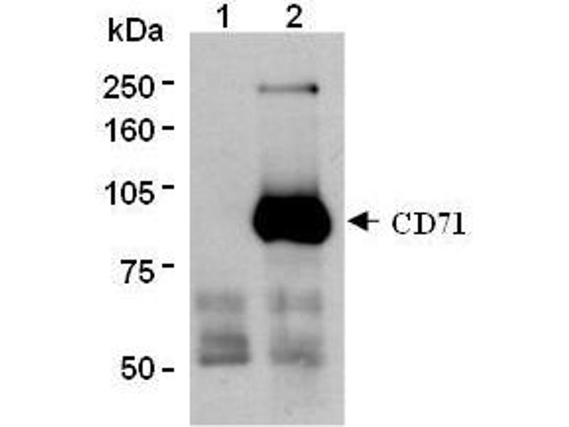 - CD71 is a homodimeric type II transmembrane glycoprotein consisting of two disulfide-bonded 95 kDa chains. CD71 is the transferrin receptor (TfR). The CD71 binds iron saturated holo-transferrin on the cell surface and is internalized and transported to early sorting endosomes, where the complexed iron is rapidly separated from transferrin. Subsequently, the CD71-transferrin complex accumulates within recycling endosomes and then recycles to the plasma membrane. On the cell surface, iron-free apotransferrin has negligible affinity for CD71, and is released from the cell, ready to begin a new cycle. CD 71 is expressed on activated B and T cells, macrophages, reticulocytes, erythroid precursors, and malignant tissues. Particularly high expression of CD71 is reported in the reticulocytes and erythroid series, reflecting the requirement for iron in hemoglobin. CD71 expression is upregulated on immature proliferating cells and low levels on resting mature lymphocytes. In addition to this general function, CD71 appears to play a costimulatory role in T cell activation and receptor for IgA1 antibodies.Synonyms: TfR1, Transferrin receptor protein 1, p90