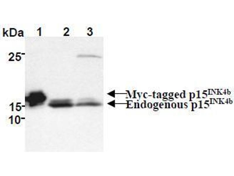 - This antibody reacts with p15INK4b (15 kDa).
