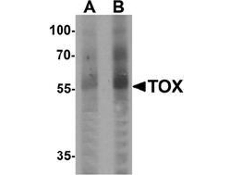 - TOX (thymocyte selection-associated high mobility group (HMG) box protein) is a member of the HMG box family of DNA-binding proteins and likely plays a role in the regulation of T-cell development (1,2). It is a 526 amino acid nuclear protein and the expression of TOX is upregulated by pre-T cell receptor (pre-TCR) and TCR activation in immature thymocytes. TOX-mediated positive selection is associated with up-regulation of RUNX3 and is calcineurin dependent. TOX-dependent transition to the CD4+CD8 stage is required for development of class II major histocompatibility complex-specific T cells.Synonyms: KIAA0808, Thymocyte selection-associated high mobility group box protein TOX, Thymus high mobility group box protein TOX