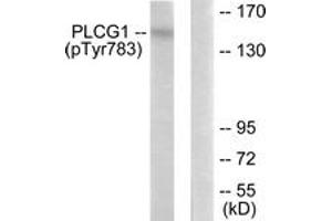 PLCG1 (Phospho-Tyr783) Antibody detects endogenous levels of PLCG1 only when phosphorylated at Tyr783.