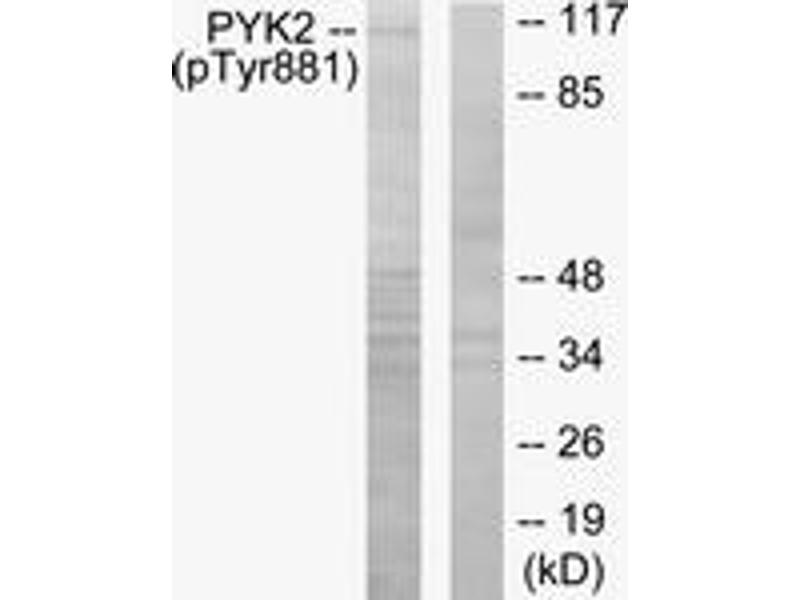 PYK2 (Phospho-Tyr881) Antibody detects endogenous levels of PYK2 only when phosphorylated at Tyr881.
