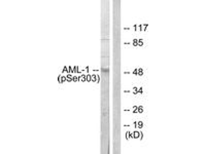 AML1 (Phospho-Ser303) Antibody detects endogenous levels of AML1 only when phosphorylated at Ser303.