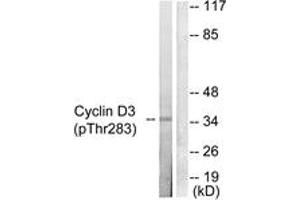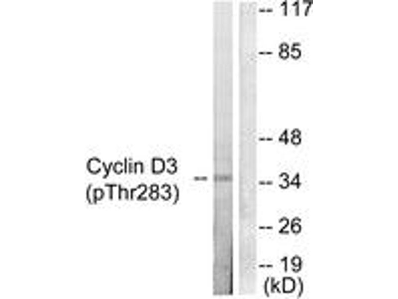 Cyclin D3 (Phospho-Thr283) Antibody detects endogenous levels of Cyclin D3 only when phosphorylated at Thr283.