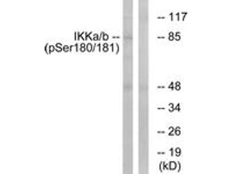 IKK-alpha/beta (Phospho-Ser180/181) Antibody detects endogenous levels of IKK-alpha/beta only when phosphorylated at Ser180/181.