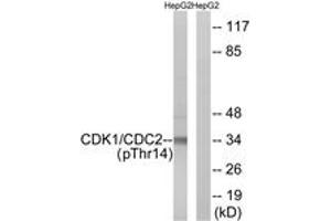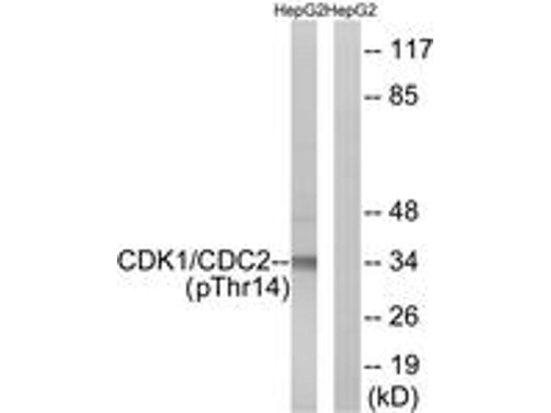 CDK1/CDC2 (Phospho-Thr14) Antibody detects endogenous levels of CDK1/CDC2 only when phosphorylated at Thr14.