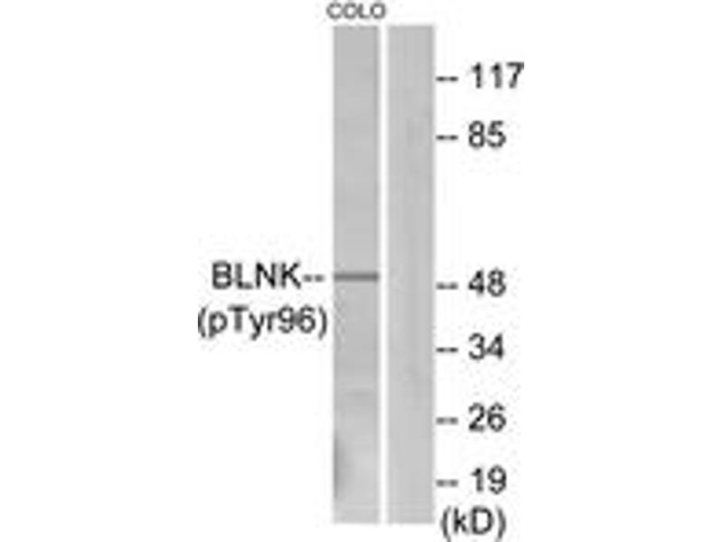 BLNK (Phospho-Tyr96) Antibody detects endogenous levels of BLNK only when phosphorylated at Tyr96.