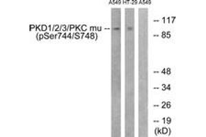 PKD1/2/3/PKC mu (Phospho-Ser738+Ser742) Antibody detects endogenous levels of PKD1/2/3/PKC mu only when phosphorylated at Ser738 and Ser742.
