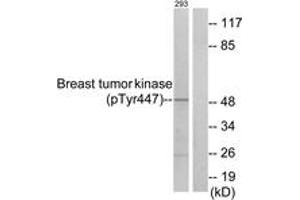 Breast Tumor Kinase (Phospho-Tyr447) Antibody detects endogenous levels of Breast Tumor Kinase only when phosphorylated at Tyr447.