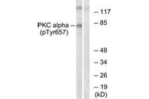 PKC alpha (Phospho-Tyr657) Antibody detects endogenous levels of PKC alpha only when phosphorylated at Tyr657.