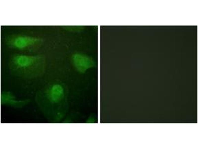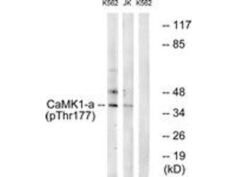 CaMK1-alpha (Phospho-Thr177) Antibody detects endogenous levels of CaMK1-alpha only when phosphorylated at Thr177.