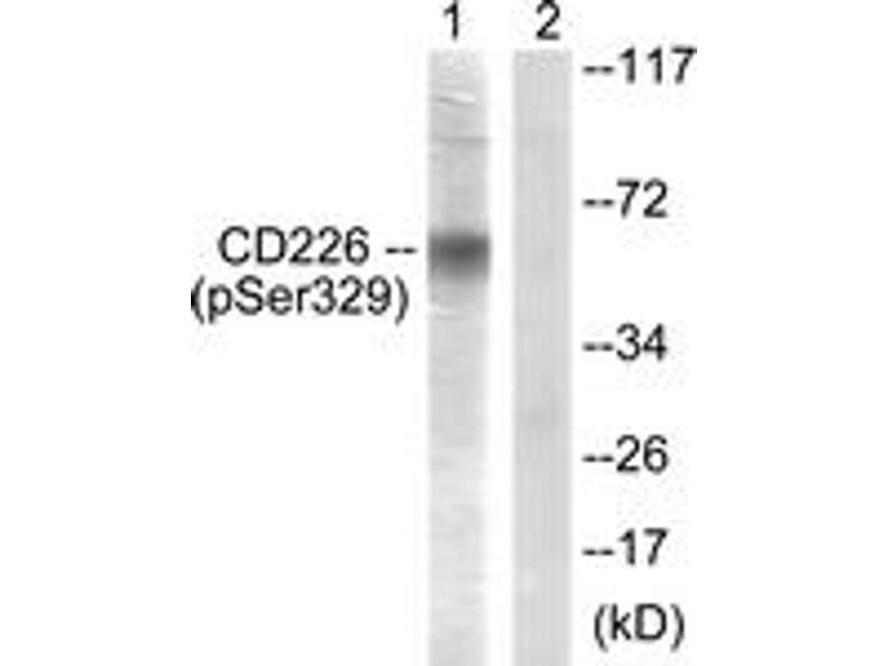 CD226/DNAM-1 (Phospho-Ser329) Antibody detects endogenous levels of CD226/DNAM-1 only when phosphorylated at Ser329.