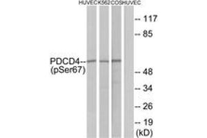PDCD4 (Phospho-Ser67) Antibody detects endogenous levels of PDCD4 only when phosphorylated at Ser67.
