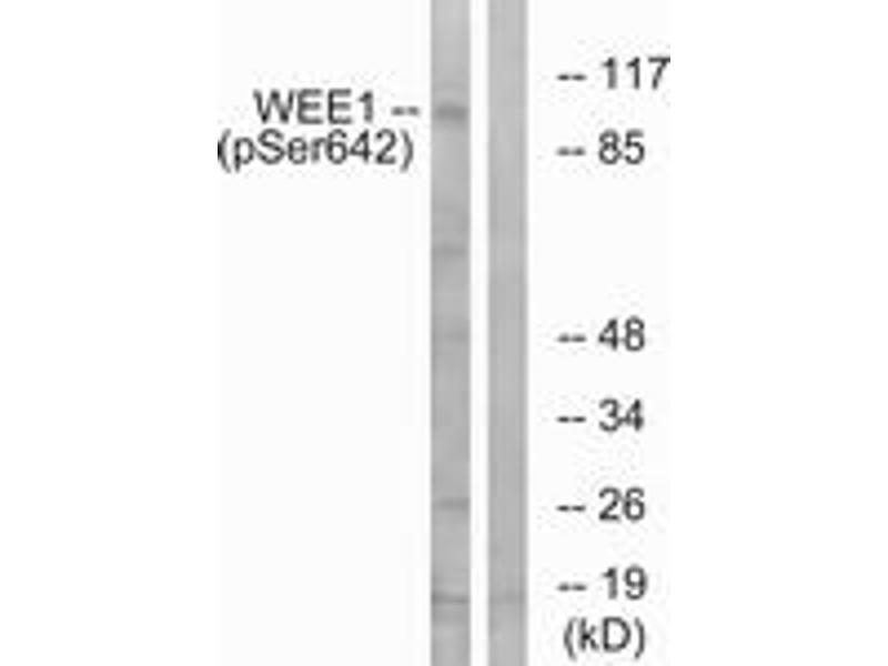 WEE1 (Phospho-Ser642) Antibody detects endogenous levels of WEE1 only when phosphorylated at Ser642.