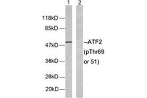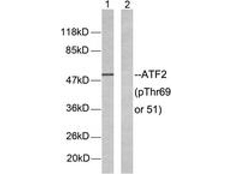 ATF2 (Phospho-Thr69 or 51) Antibody detects endogenous levels of ATF2 only when phosphorylated at Thr69 or 51.