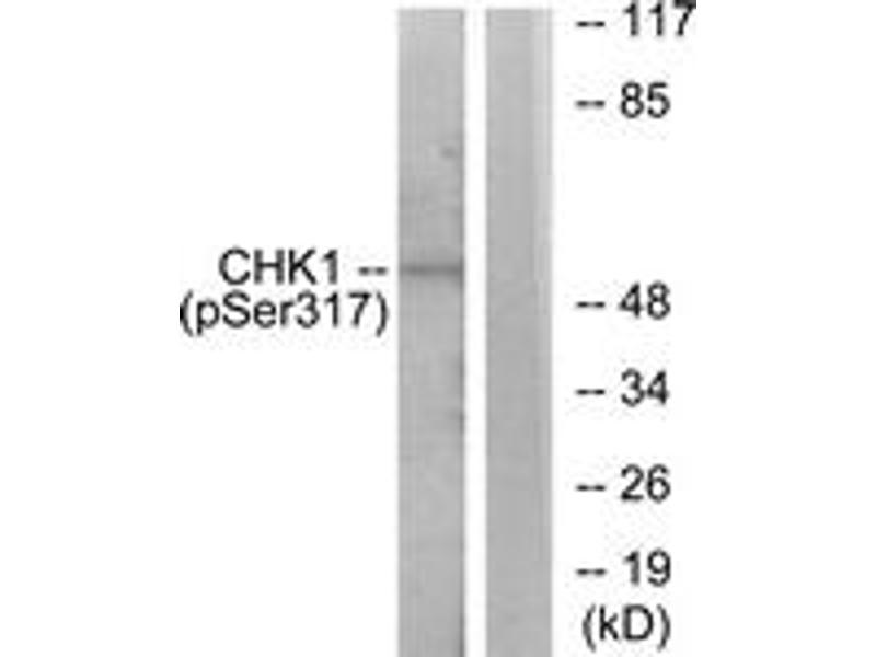 Chk1 (Phospho-Ser317) Antibody detects endogenous levels of Chk1 only when phosphorylated at Ser317.