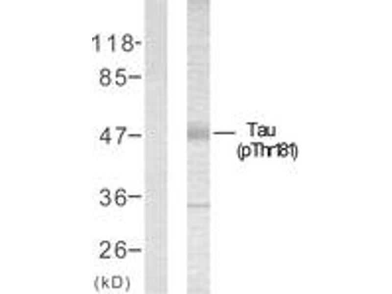 Tau (Phospho-Thr181) Antibody detects endogenous levels of Tau only when phosphorylated at Thr181.