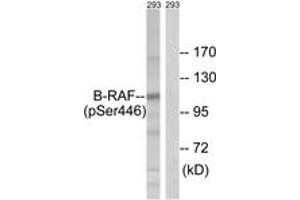 B-RAF (Phospho-Ser446) Antibody detects endogenous levels of B-RAF only when phosphorylated at Ser446.