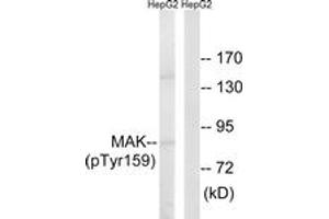 MAK (Phospho-Tyr159) Antibody detects endogenous levels of MAK only when phosphorylated at Tyr159.