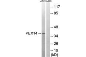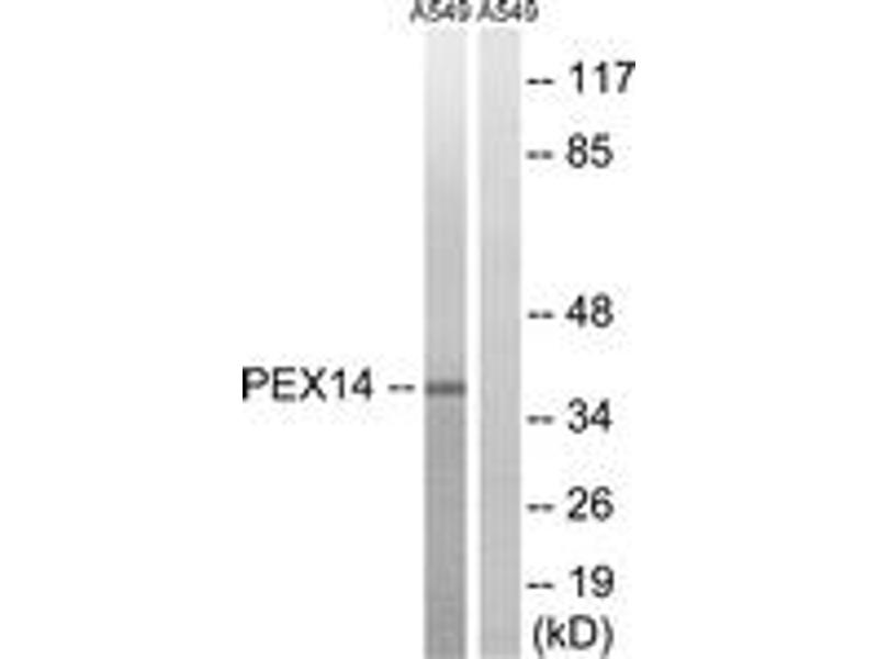 Synonyms: Peroxisomal membrane protein PEX14,Peroxin-14, Peroxisomal membrane anchor protein PEX14, PTS1 receptor docking protein