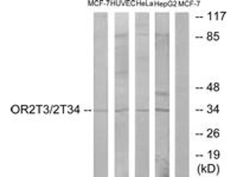 OR2T3/2T34 Antibody detects endogenous levels of total OR2T3/2T34 protein.