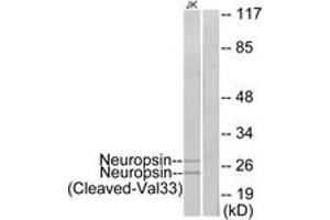 Neuropsin (Cleaved-Val33) Antibody detects endogenous levels of fragment of activated Neuropsin resulting from cleavage adjacent to Val33.