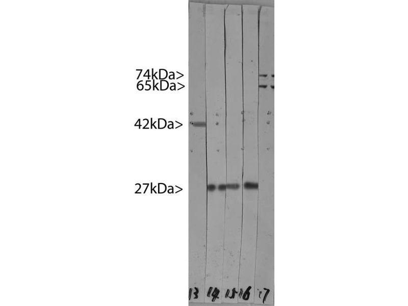 - The antibody solution can be used at dilutions of at least 1:1,000 in immunofluorescence experiments. In western blotting using chemiluminescence it can be used at dilutions of 1:10,000 or lower.