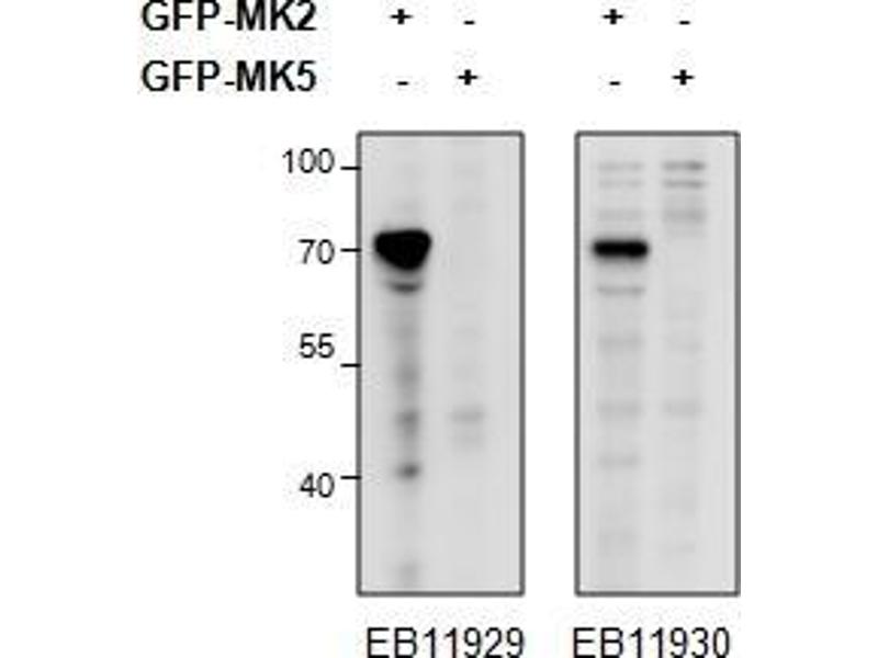 Immunoprecipitation: MK2/MK3 double knockout MEFs retrovirally transduced wiith MK2 or empty vector were lysed from confluent plates and used for IP with 1.5ug EB11929 or EB11930. Western blots of the IP were labelled with rabbit anti-MK2