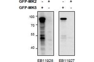 Western Blot: In transfected HEK293 transiently expressing either Mouse MK5 fused to GFP or the similar Mouse MK2 fused to GFP, only the expected band was observed in the MK5 lane after EB11927 labeling. Data obtained from Dr. M. B. Menon, Inst. Biochemi