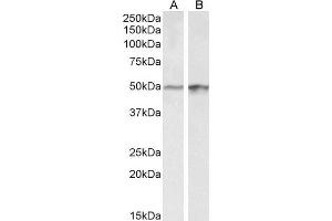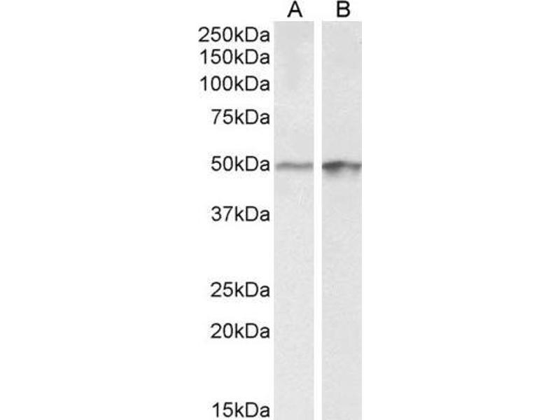 Western Blot: Approx 50 kDa band observed in lysates of cell lines A431 and HeLa (calculated MW of 44.0 kDa according to NP_001941.2). Recommended concentration: 0.1-0.3 μg/mL. Approx 40+50 kDa bands observed in Pig Brain and Heart lysates (calculated MW of