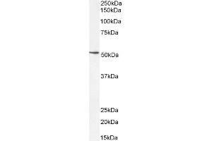 Western Blot: Approx 50 kDa band observed in Human Brain (Cerebellum) and approx. 52 kDa in Mouse Brain lysates (calculated MW of 49.9 kDa according to Human NP_008872.1 and Mouse NP_035567.1). Recommended concentration: 0.03-0.1 μg/mL. Primary incubation 1