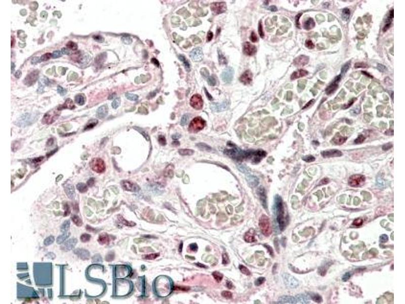 Immunohistochemistry: In paraffin embedded Human Placenta shows staining in select nuclei. Recommended concentration, 5-10 μg/mL.