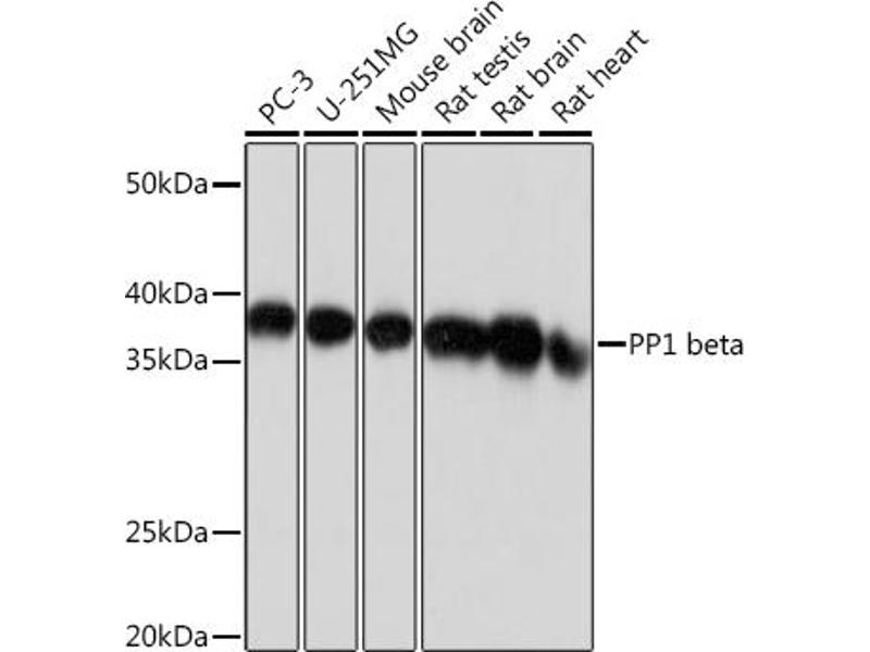 The protein encoded by this gene is one of the three catalytic subunits of protein phosphatase 1 (PP1). PP1 is a serine/threonine specific protein phosphatase known to be involved in the regulation of a variety of cellular processes, such as cell division, glycogen metabolism, muscle contractility, protein synthesis, and HIV-1 viral transcription. Mouse studies suggest that PP1 functions as a suppressor of learning and memory. Two alternatively spliced transcript variants encoding distinct isoforms have been observed. [provided by RefSeq, Jul 2008],HEL-S-80p, PP-1B, PP1B, PP1beta, PPP1CD,Cancer,Endocrine & Metabolism,Epigenetics & Nuclear Signaling,Insulin Receptor Signaling Pathway,Lipid Metabolism,MAPK-Erk Signaling Pathway,Neurodegenerative Diseases,Neurodegenerative Diseases_Dopamine Signaling in Parkinsons Disease,Neuroscience,Signal Transduction,Translation Control,Translational Control_Regulation of eIF2,PPP1CB