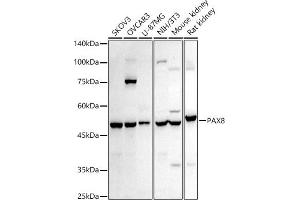 This gene encodes a member of the paired box (PAX) family of transcription factors. Members of this gene family typically encode proteins that contain a paired box domain, an octapeptide, and a paired-type homeodomain. This nuclear protein is involved in thyroid follicular cell development and expression of thyroid-specific genes. Mutations in this gene have been associated with thyroid dysgenesis, thyroid follicular carcinomas and atypical follicular thyroid adenomas. Alternatively spliced transcript variants encoding different isoforms have been described.,PAX8,Epigenetics & Nuclear Signaling,Transcription Factors,Signal Transduction,G protein signaling,G-Protein-Coupled Receptors(GPCR),Neuroscience,PAX8
