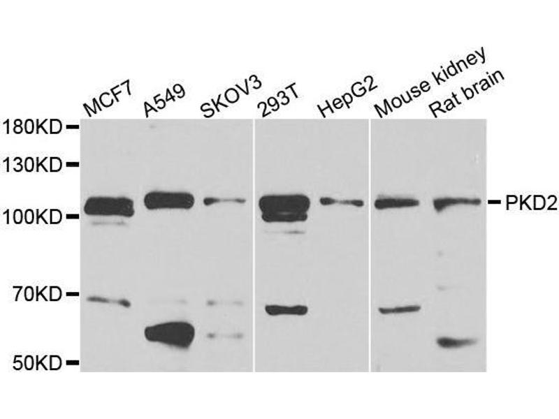 This gene encodes a member of the polycystin protein family. The encoded protein is a multi-pass membrane protein that functions as a calcium permeable cation channel, and is involved in calcium transport and calcium signaling in renal epithelial cells. This protein interacts with polycystin 1, and they may be partners in a common signaling cascade involved in tubular morphogenesis. Mutations in this gene are associated with autosomal dominant polycystic kidney disease type 2.,PKD2,APKD2,PC2,PKD4,Pc-2,TRPP2,Cancer,Signal Transduction,Cell Biology & Developmental Biology,Cell Cycle,Centrosome,Growth factor,EGF,Endocrine & Metabolism,Neuroscience,Calcium Signaling,PKD2