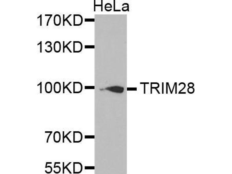 The protein encoded by this gene mediates transcriptional control by interaction with the Kruppel-associated box repression domain found in many transcription factors. The protein localizes to the nucleus and is thought to associate with specific chromatin regions. The protein is a member of the tripartite motif family. This tripartite motif includes three zinc-binding domains, a RING, a B-box type 1 and a B-box type 2, and a coiled-coil region.,KAP1,PPP1R157,RNF96,TF1B,TIF1B,TRIM28,Epigenetics & Nuclear Signaling,Transcription Factors,Cancer,Invasion and Metastasis,Cell Biology & Developmental Biology,Apoptosis,Ubiquitin,TRIM28