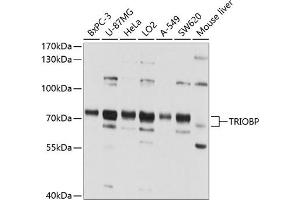 This gene encodes a protein with an N-terminal pleckstrin homology domain and a C-terminal coiled-coil region. The protein interacts with trio, which is involved with neural tissue development and controlling actin cytoskeleton organization, cell motility and cell growth. The protein also associates with F-actin and stabilizes F-actin structures. Mutations in this gene have been associated with a form of autosomal recessive nonsyndromic deafness. Multiple alternatively spliced transcript variants that would encode different isoforms have been found for this gene, however some transcripts may be subject to nonsense-mediated decay (NMD).,TRIOBP,DFNB28,HRIHFB2122,TAP68,TARA,dJ37E16.4,Signal Transduction,Cell Biology & Developmental Biology,Cytoskeleton,Microfilaments,Neuroscience,TRIOBP