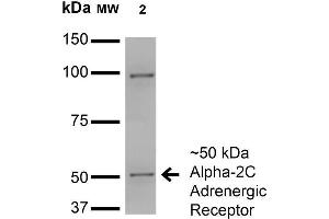1 μg/ml of ABIN1686644 was sufficient for detection of Alpha2C Adrenergic Receptor in 20 μg of COS cells transiently transfected with HA-tagged Alpha- lysate and assayed by colorimetric immunoblot analysis using goat anti-mouse IgG:HRP as the secondary antibody.