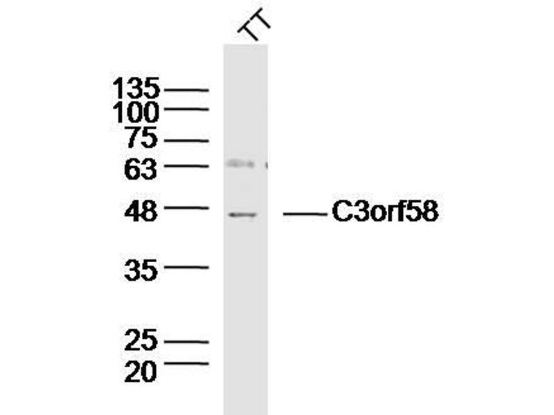 Background: C3orf58 (chromosome 3 open reading frame 58), also known as DIA1, is a 430 amino acid secreted protein that belongs to the UPF0672 family. C3orf58 is encoded by a gene that maps to human chromosome 3q24. Chromosome 3 is made up of approximately 214 million bases encoding over 1,100 genes. Notably, there is a chemokine receptor gene cluster and a variety of human cancer related loci on chromosome 3. Particular regions of the chromosome 3 short arm are deleted in many types of cancer cells. Key tumor suppressing genes on chromosome 3 encode apoptosis mediator RASSF1, cell migration regulator HYAL1 and angiogenesis suppressor SEMA3B. Marfan Syndrome, porphyria, von Hippel-Lindau syndrome, osteogenesis imperfecta and Charcot-Marie-Tooth disease are a few of the numerous genetic diseases associated with chromosome 3.
