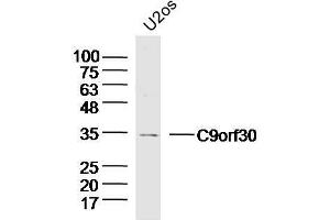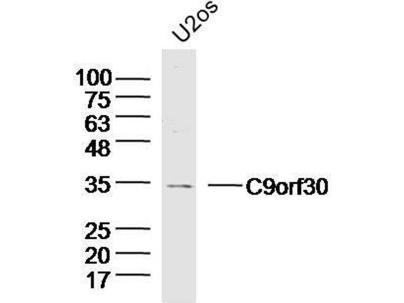 Background: C9orf30 is a 275 amino acid protein that is expressed in brain and belongs to the UPF0439 family. The gene encoding C9orf30 maps to human chromosome 9q31.1. Chromosome 9 consists of about 145 million bases, represents 4 % of the human genome and encodes nearly 900 genes. Thought to play a role in gender determination, deletion of the distal portion of 9p can lead to development of male to female sex reversal, the phenotype of a female with a male X,Y genotype. Hereditary hemorrhagic telangiectasia, which is characterized by harmful vascular defects, is associated with the chromosome 9 gene encoding endoglin protein, ENG. Familial dysautonomia is also associated with chromosome 9 though through the gene IKBKAP. Notably, chromosome 9 encompasses the largest interferon family gene cluster. Chromosome 9 is partnered with chromosome 22 in the translocation leading to the aberrant production of BCR-ABL fusion protein often found in leukemias.