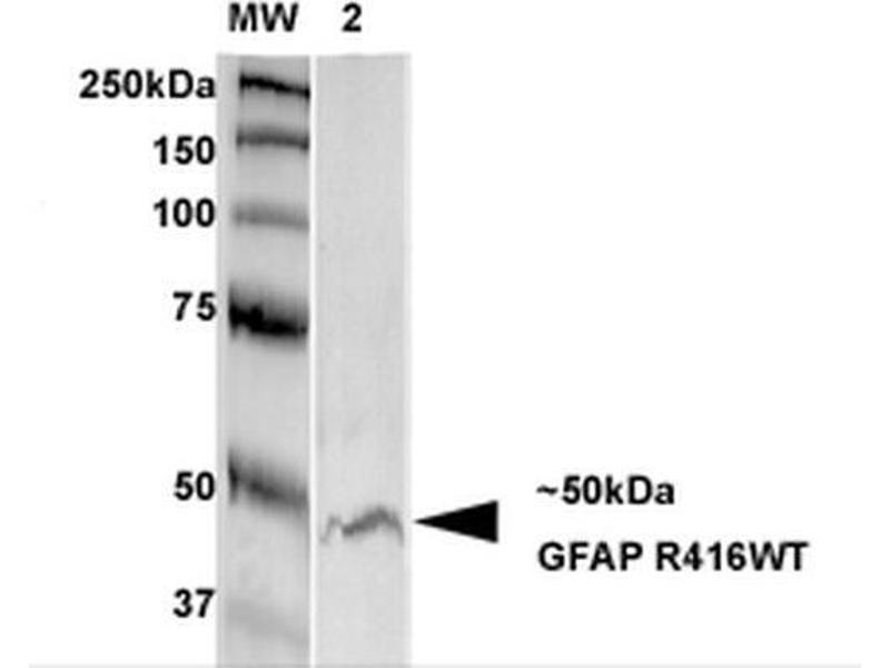 - Detects ~50 kDa. Does not cross-react with GFAP-R416W or other proteins (based on KO validation results).
