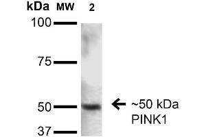 1 μg/ml of ABIN1741117 was sufficient for detection of PINK1 in 20 μg of rat brain lysate by colorimetric immunoblot analysis using Goat anti-mouse IgG:HRP as the secondary antibody.