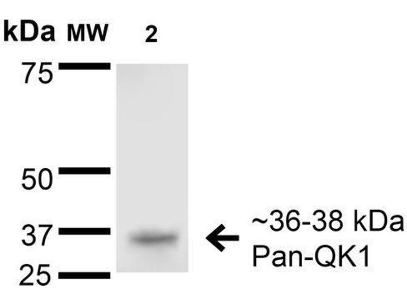 1 μg/ml of ABIN1741390 was sufficient for detection of Pan-QKI in 20 μg of rat brain lysate by colorimetric immunoblot analysis using Goat anti-mouse IgG:HRP as the secondary antibody.