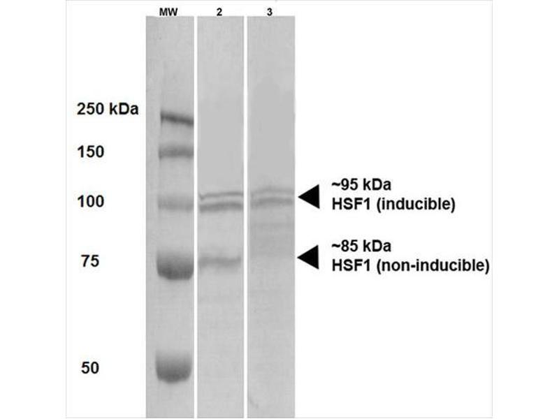 1 μg/ml of ABIN1741555 was sufficient for detection of HSF1 in 20 μg of heat shocked HeLa cell lysate by colorimetric immunoblot analysis using Rabbit anti-rat IgG: AP as the secondary antibody.