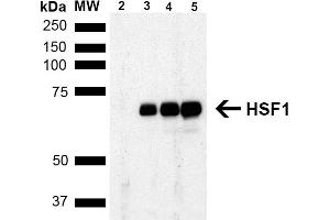 1 μg/ml of ABIN1741570 was sufficient for detection of HSF1 in 20 μg of heat shocked HeLa cell lysate by colorimetric immunoblot analysis using Rabbit anti-rat IgG: AP as the secondary antibody.