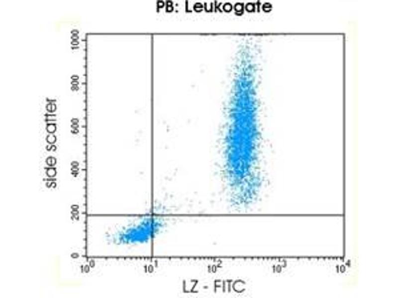 Lysozyme (LZ) is a cationic antimicrobial peptide of 14 kDa. Lysozyme is stored in primary but predominantly in specific (secondary) granules of neutrophils. It cleaves peptidoglycan constituents of the bacterial cell wall and can bind LPS. The epitope recognized by antibody LZ-2 is expressed by virtually all myeloid cells including normal and malignant granulocytes and monocytes. In normal myelopoiesis LZ can first be detected at the myeloblast stage where it appears somewhat later than MPO expression. The LZ-2 antibody permits the identification and enumeration of human myelomonocytic cells using flow cytometry. Results must be put within the context of other diagnostic tests as well as the clinical history of the patient by a certified professional before final interpretation. Analyses performed with this antibody should be paralleled by positive and negative controls.