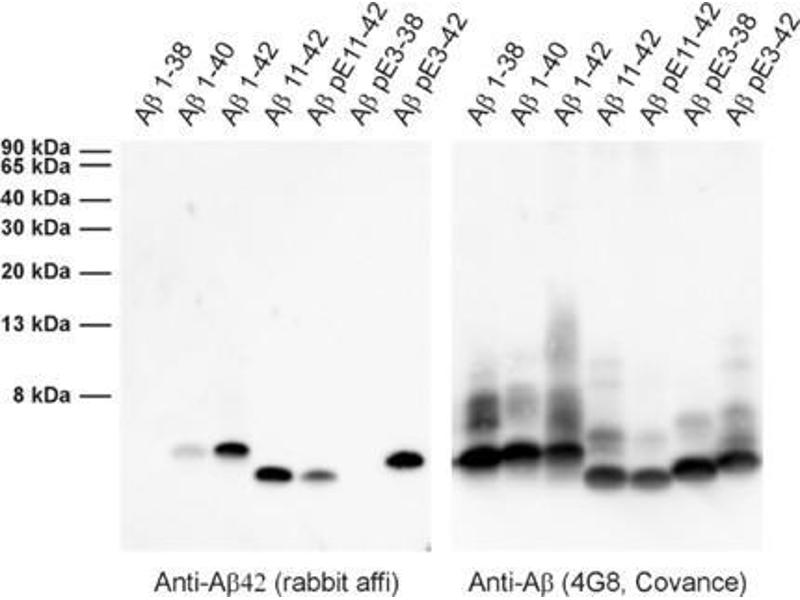 WB: Detects purified Abeta 42. Complex samples like brain extracts still have to be tested. Nitrocellulose membrane is recommended for blotting.