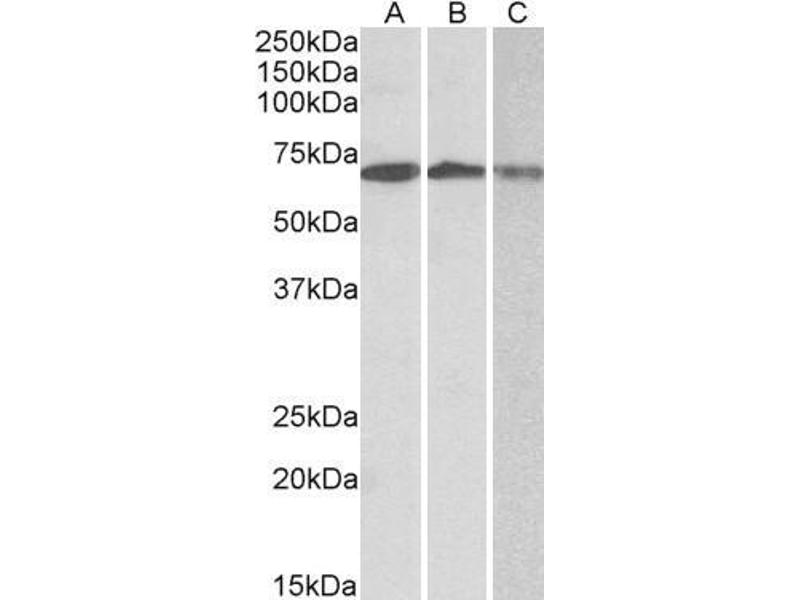 Western Blot: Approx 70 kDa band observed in lysates of cell lines Daudi, Jurkat and K562 (calculated MW of 78.8 kDa according to NP_002526.2). The observed molecular weight corresponds to earlier findings in literature with different antibodies (Lin et al