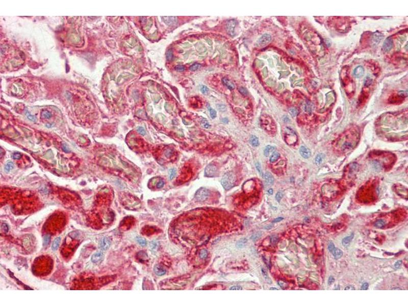 Immunohistochemistry: Paraffin embedded Human Placenta and Kidney. Recommended concentration: 5 μg/mL.