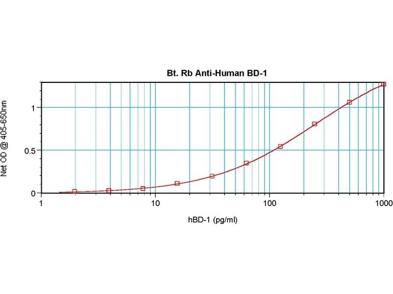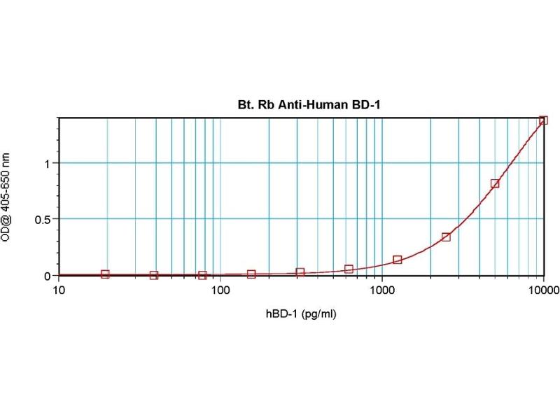 ELISA: Direct: To detect Human BD-1 (using 100 μL/well antibody solution) a concentration of0.25-1.0 μg/mL of this antibody is required. In conjunction with compatible secondaryreagents, it allows the detection of at least 0.2-0.4 ng/well of recombinant Human BD-1. Sandwich: To detect Human BD-1 (using 100 μL/well antibody solution) a concentration of0.25-1.0 μg/mL of this antibody is required. In conjunction with Polyclonal Anti-Human BD-1(AP01151PU) as a capture antibody, it allows the detection of at least 0.2-0.4 ng/well ofrecombinant Human BD-1. Western blot: To detect Human BD-1 this antibody can be used at a concentration of 0.1-0.2 μg/mL. Used in conjunction with compatible secondary reagents the detection limit forrecombinant Human BD-1 is 1.5-3.0 ng/lane, under either reducing or non-reducingconditions.